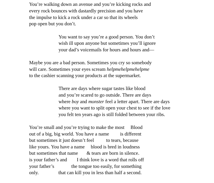 An average poet’s psychoanalysis by Mal Fawzy 01.19.202601.17.2026 by vagabondcitypoetry Mal Fawzy is a Brown author living in Italy. He likes cats, summer days, and writing his heart out. Share this: Share on X (Opens in new window) X Share on Facebook (Opens in new window) Facebook Like Loading... vagabondcitypoetry Related